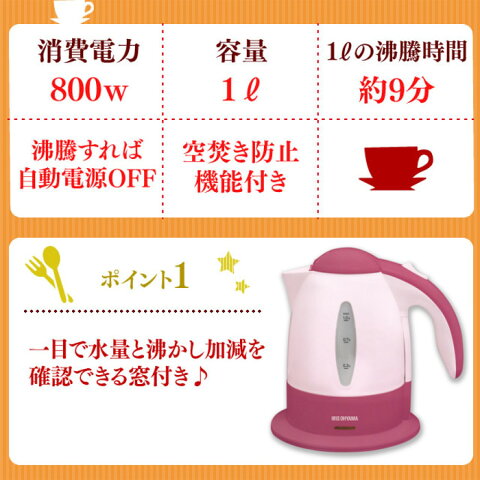 本体と電源プレートがセパレート式になっているので本体の持ち運びがしやすいです! ●カラー:ホワイト・ピンク ●商品サイズ(cm):幅約22×奥行約17×高さ21 ●重量(約):725g ●材質:ポリプロピレン ●電源:AC100V(50/60Hz共用) ●消費電力:800W ●容器容量(約):1L ●沸騰時間(約):9分(1Lあたり) ●コード長(約):1.1m(コードレス) ◇◆おすすめ商品◆◇ ・たこ焼きプレート ITY-18A-R レッド アイリスオーヤマ ・たこ焼き2WAYプレート ITY-20WA-R レッド アイリスオーヤマ ・網焼き風ホットプレート(2枚) APA-134-T ブラウン アイリスオーヤマ ・網焼き風ホットプレート(3枚) APA-135-T ブラウン アイリスオーヤマ ・マルチロースター EMR-1101 レッド アイリスオーヤマ ・電気ケトル IKE-1001 ホワイト・ピンク アイリスオーヤマ ・オーブントースター OTR-86 ホワイト アイリスオーヤマ ・オーブントースター OTR-100 ホワイト アイリスオーヤマ ・オーブントースター OTR-100C ホワイト アイリスオーヤマ