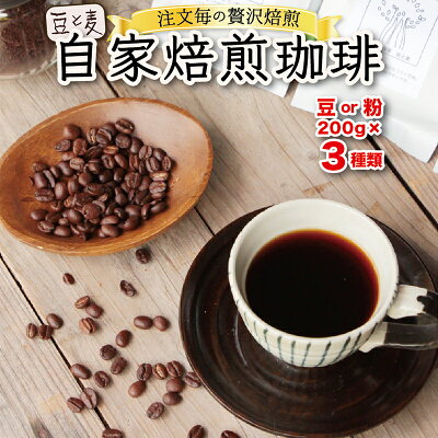 【ふるさと納税】《自家焙煎》豆と麦の人気コーヒー(豆)or(粉)200g×3種類セット